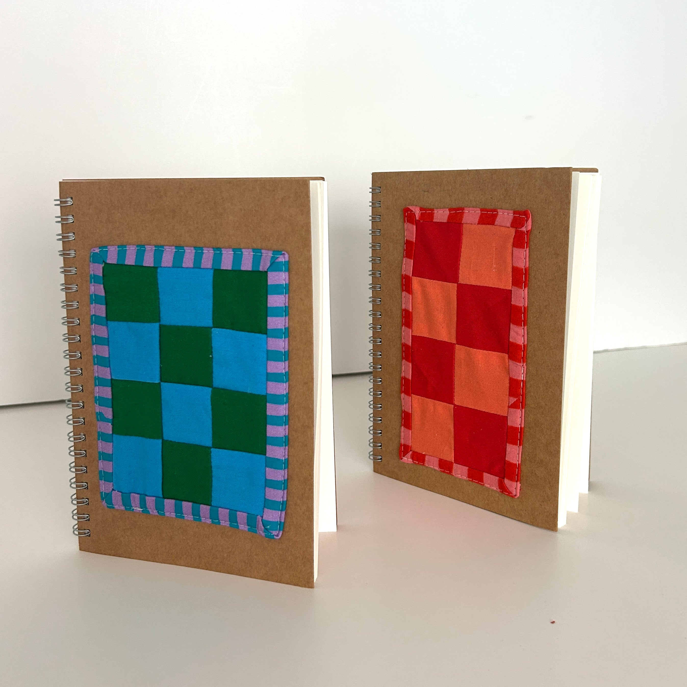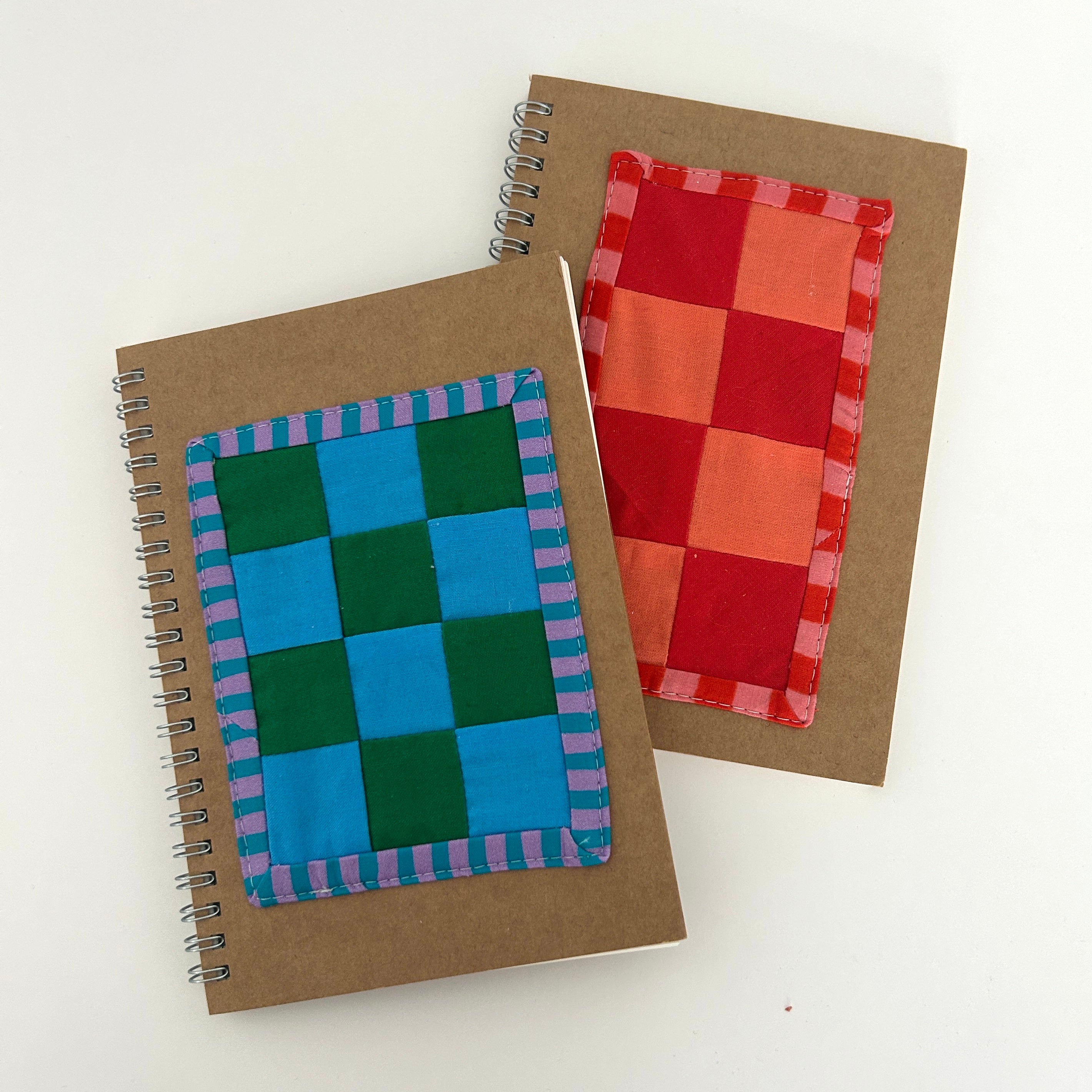 Unlined spiral sketch book with a mini quilt sewn to the front. Once your done with your sketchbook, journal, or day planner, you can cut off the quilt and frame it or make it a magnet for your fridge, or whatever you can think of!