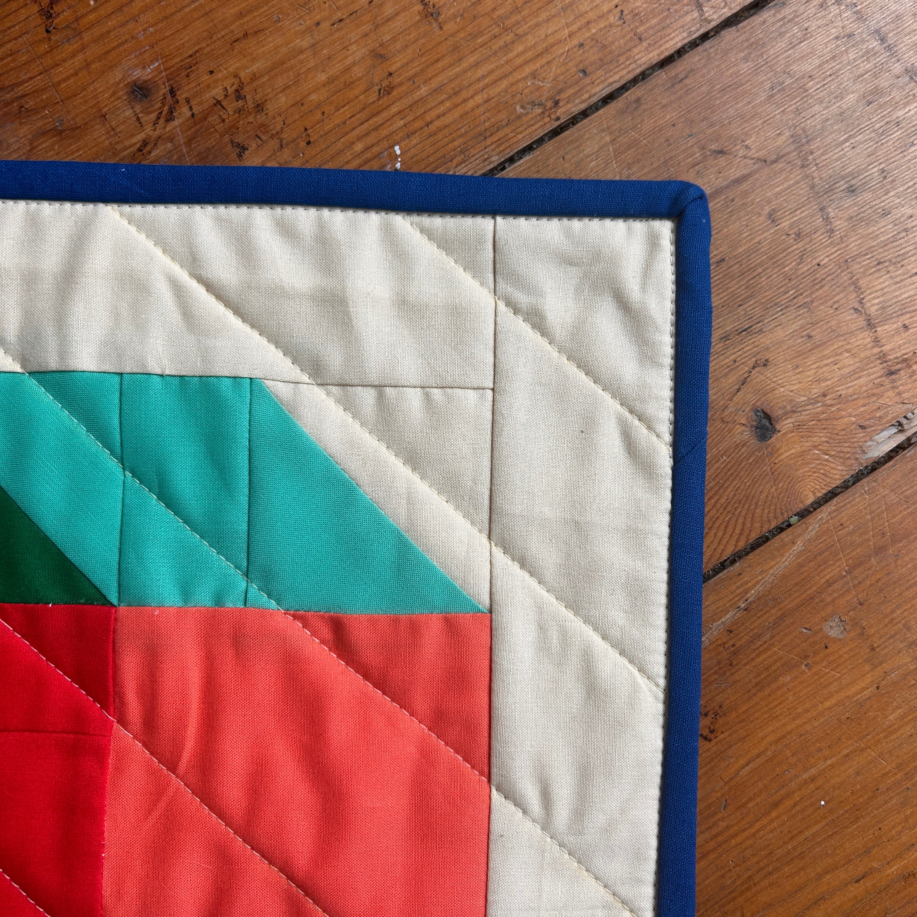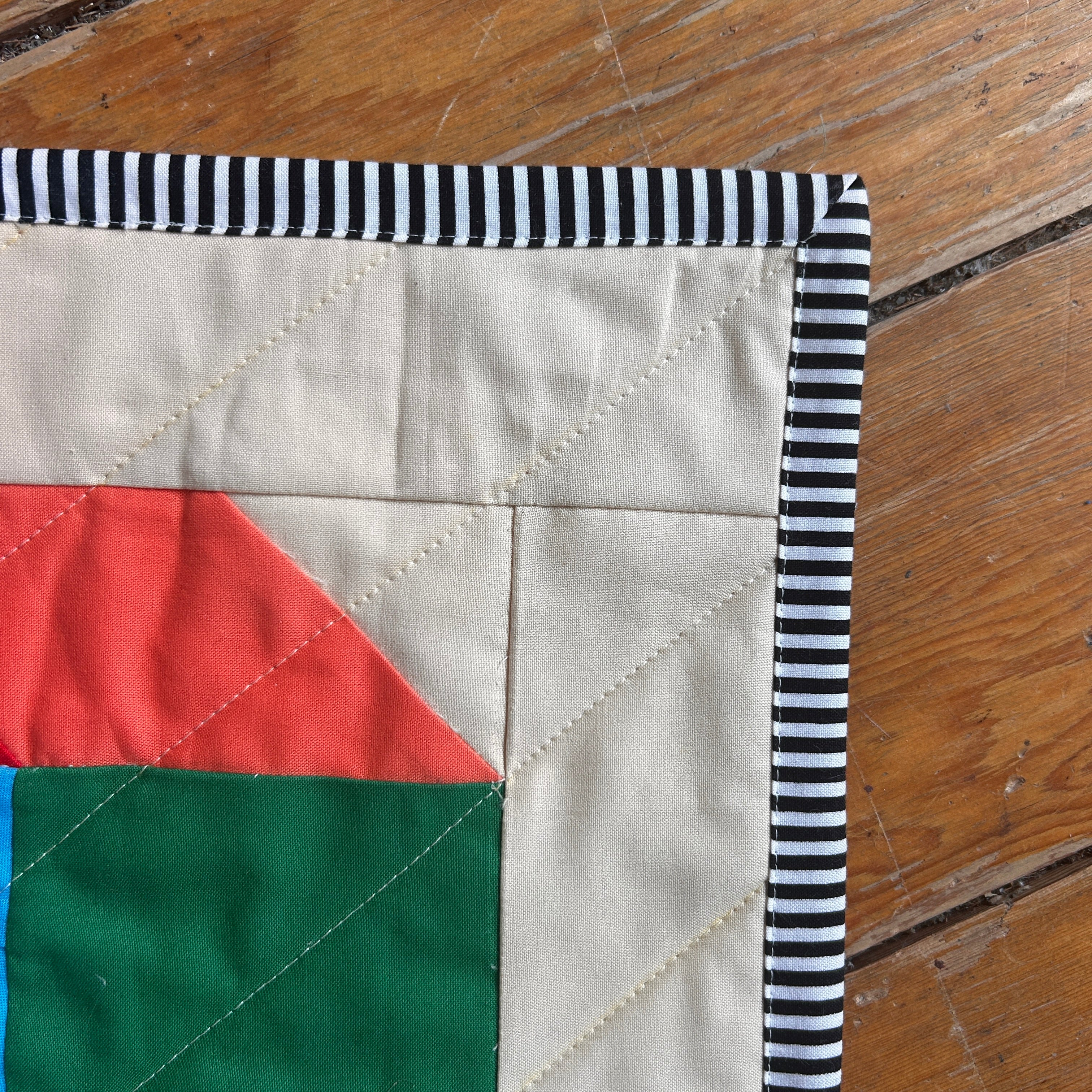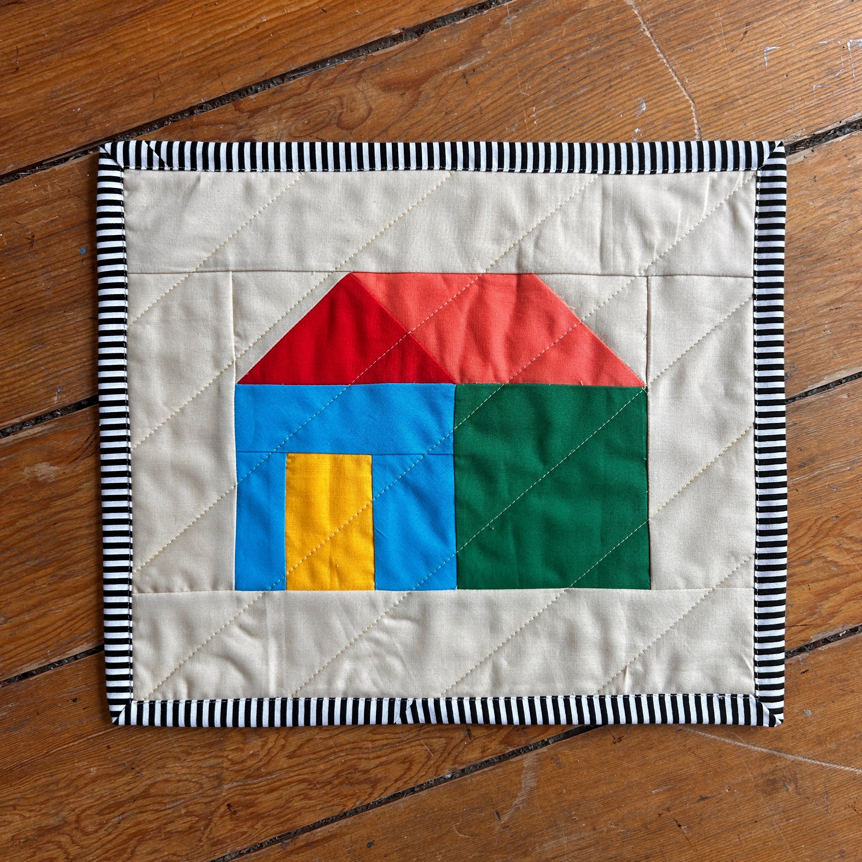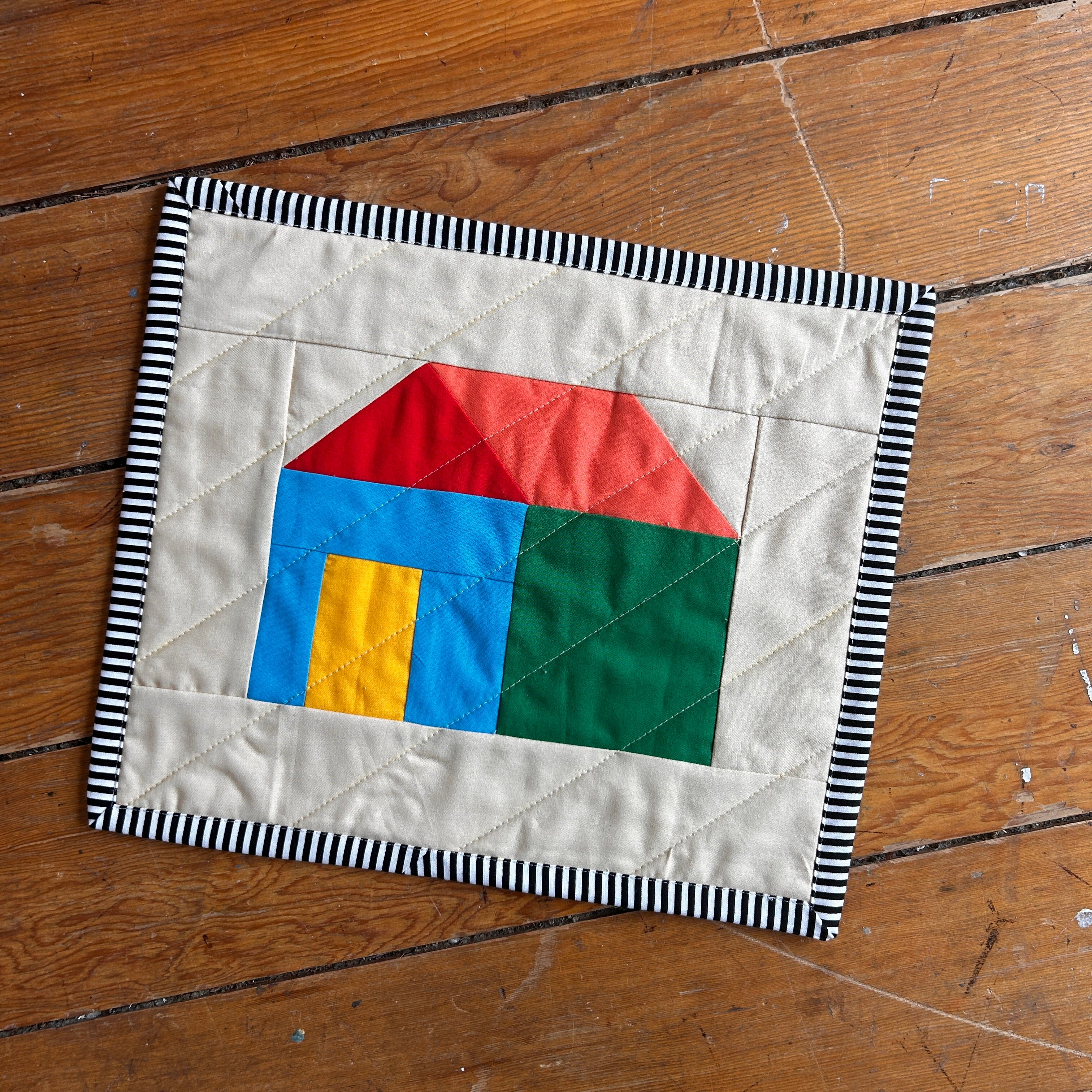 This cheerful little hand pieced house block quilt is ready to hang on your wall, cozy up your table as a runner, or or settle in as a delightful placemat.